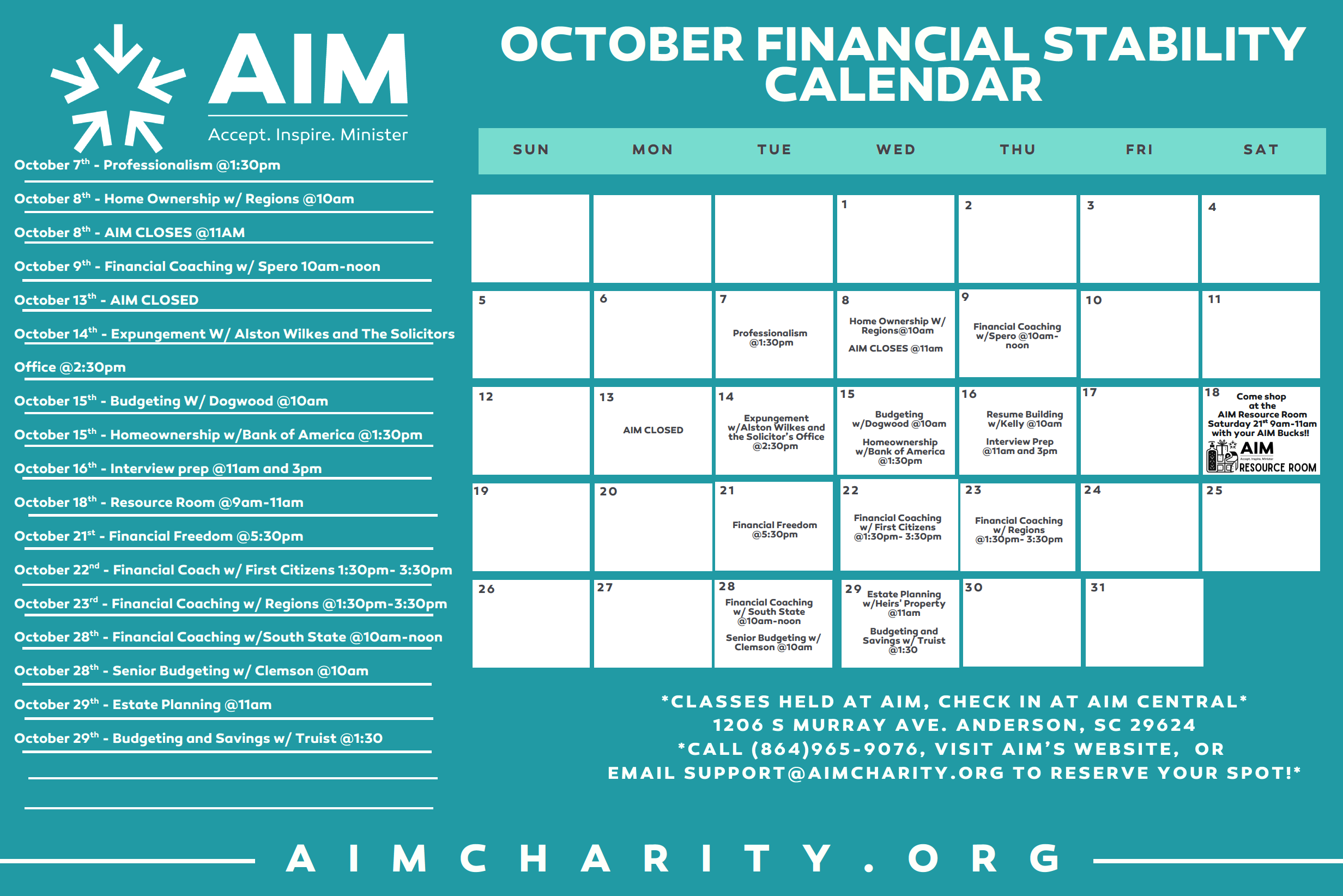 The United Way Financial Stability Center at AIM is the hub for services that support community financial wellness. Monthly classes and workshops are FREE to all. In addition, eligible individuals may benefit from the Volunteer Income Tax Assistance (VITA) program and the X-Factor employment training.